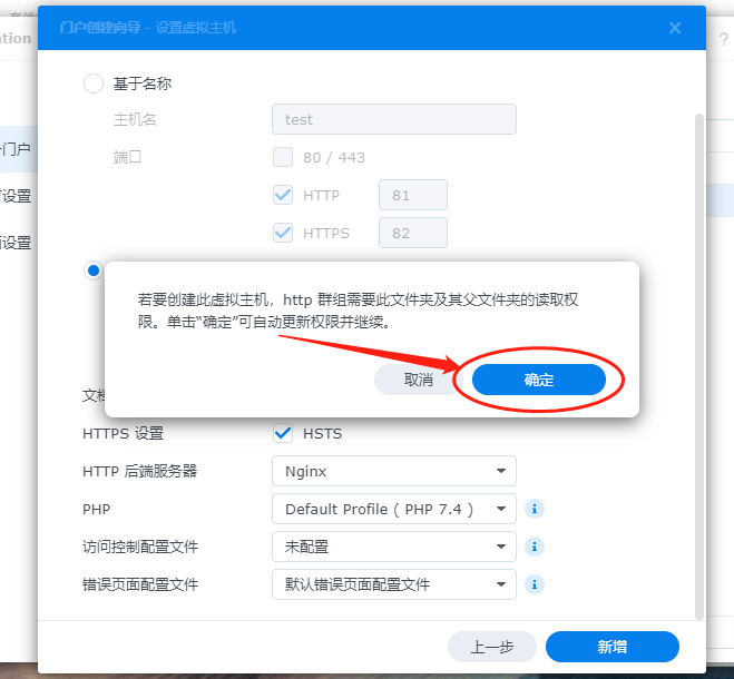 这些设置完成后,就可以点击下方的“新增”按钮,创建新的虚拟网页主机。此时可能会跳出对应权限的许可,我们点击“确认”即可。