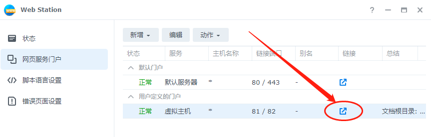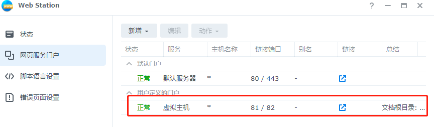 接着,在web station就会显示出我们创建的新的主机,也证明我们新建的静态网页设置成功。
