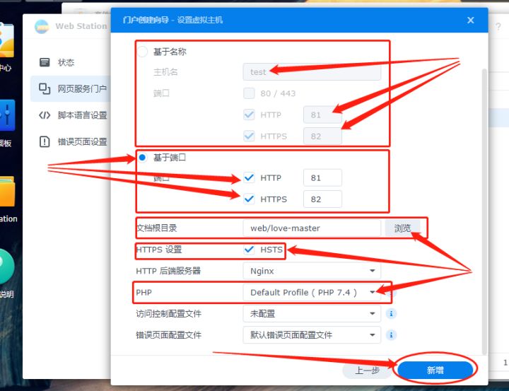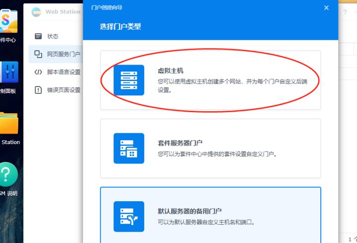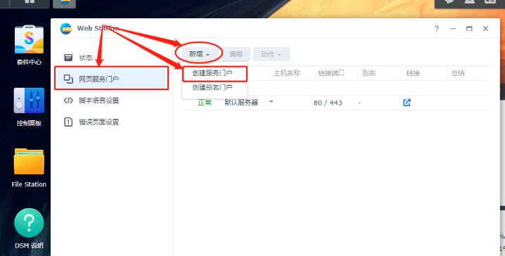 完成网页文件夹的移动后,我们就能对web station进行简单设置,使其生成本地网页运行的环境。点击web station图表下方的“打开”按钮,进入web station的主界面,我们点击左侧的“网页服务门户”项,点击页面上方的“新增”,在跳出的选择框中选择“创建服务门户”,生成一个网页运行容器。