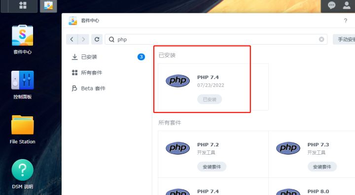 打开群晖系统的套件中心,在搜索框中输入php,从中找到php7.4,点击图标下方的“安装套件”进行安装。
