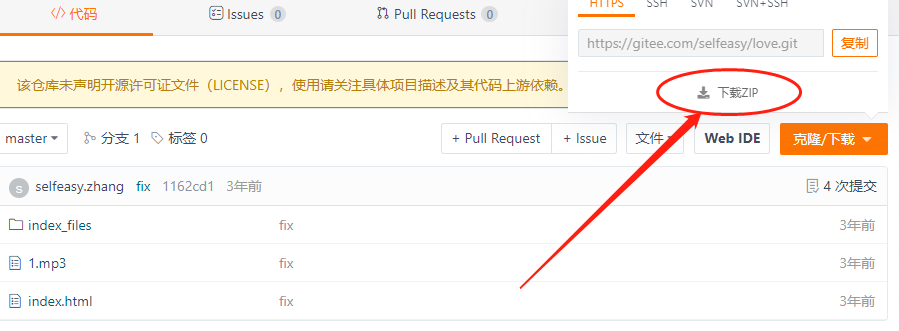 在进行web station的设置之前,我们先找一个简单网页的源代码,用于我们的网页展示。这里我选择的源代码为开源网页(感谢制作者的开源共享),下载地址为“https://gitee.com/selfeasy/love”,为方便操作,可以zip格式下载