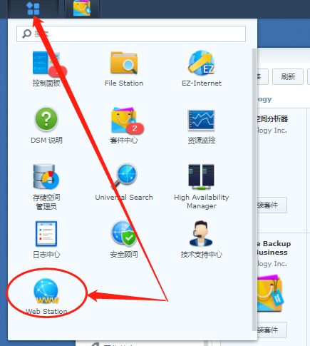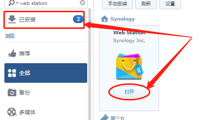 在web station安装完成后,可以直接在安装界面点击“打开”,也可以点击左上角的徽标,在弹出的面板中打开