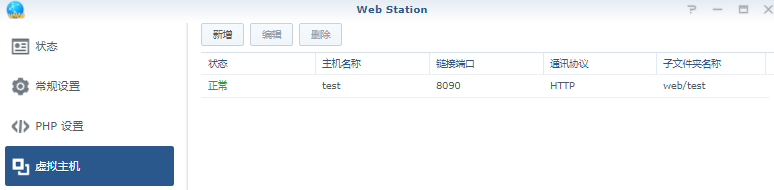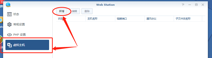 接着,我们点击web station主页面左侧的“虚拟主机”按钮,在这里配置我们的网站设置。点击页面上方的“新增”