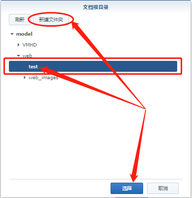 这里需要特别说下“文档根目录”空格,这个空格是web station生成网页的文件来源,我们的网页文件也要装在这个文件夹里,所以我们需要慎重选择。在这个例子中,我点选了该格后方的“浏览”,在弹出的文档根目录列表中,选择在web文件夹下新建了“test”文件夹(之后的网页文件也会放在这个文件夹里)