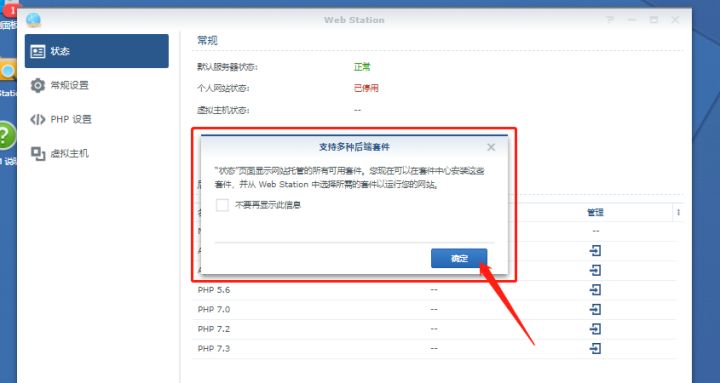 如果是全新安装的群辉系统,在打开web station时可能会提示安装可用套件,由于我们准备建设的是静态网站(页面就是一个个静态的文件),没有多少数据交换和数据渲染的需求,因此可装可不装(但是PHP系列还是要装一个的)。