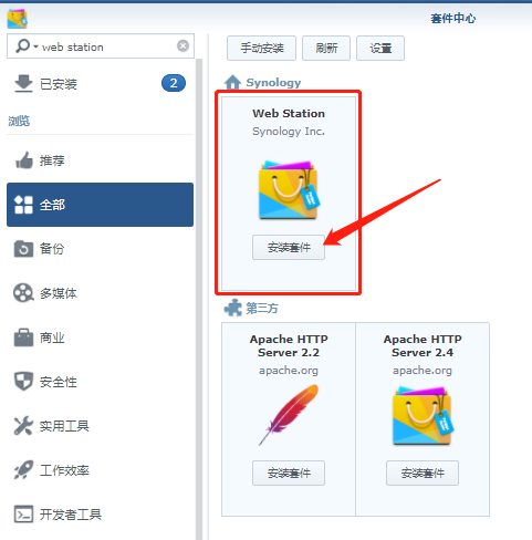 要在群晖系统上创建网页,与在其他系统上创建网页大同小异,我们必须先在群晖NAS上搭起一个可供网页运行的环境,而这个网页运行环境并不需要很复杂,群晖套件中心中有一款web station的套件。我们只要打开“套件中心”,在搜索框内输入web station,再回车搜索。