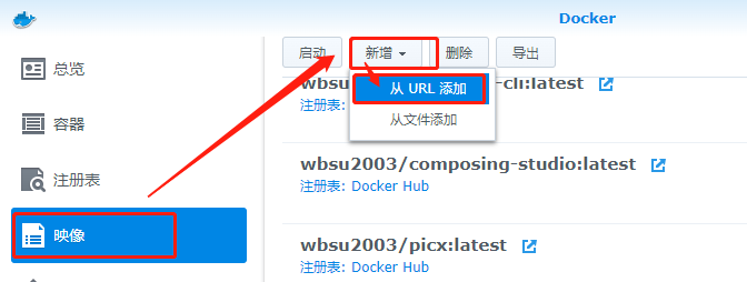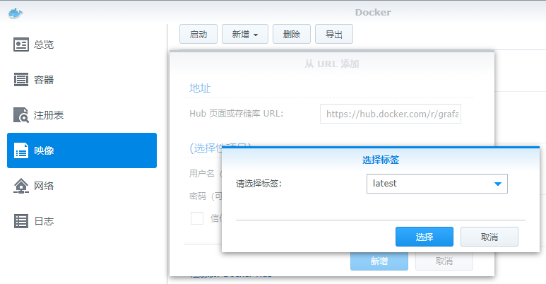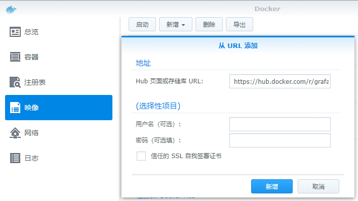 所以可以从群晖 docker 管理器中的添加, 映像 –> 新增 –> 从 URL 添加