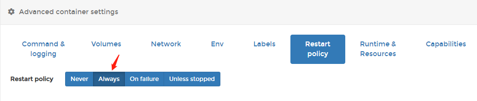 在 Advanced container setting 中找到 Restart policy,选择 Always