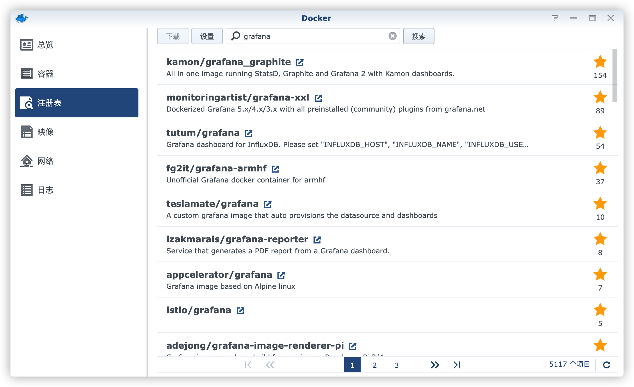 在注册表中搜索 grafana ,居然找不到 grafana/grafana,这个问题在群晖的论坛里也有人问:Can’t find Grafana in Docker Registry?