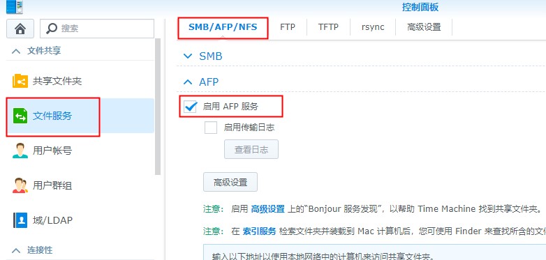 登录群晖NAS管理后台 ; 控制面板 ; 文件服务 ; SMB/AFP/NFS